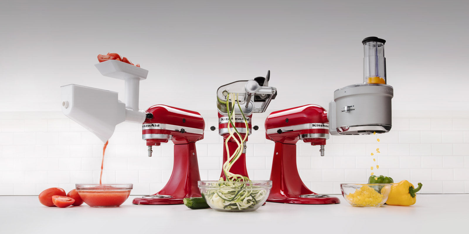 KitchenAid biedt een breed assortiment accessoires, zoals een pastaroller, vleesmolen, groentesnijder, citruspers en ijsbereider. Alle accessoires passen op de universele aansluiting van de keukenmachine, waardoor één apparaat geschikt is voor talloze bereidingen.