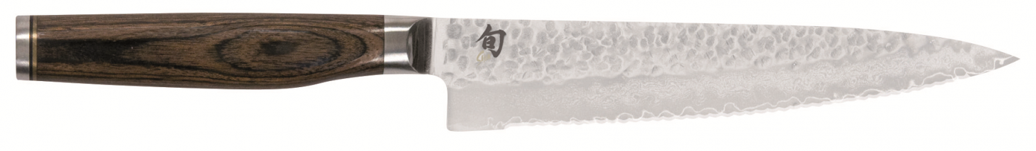 De Shun Premier Tim Mälzer-serie is speciaal afgestemd op de behoeften en eisen van professionele koks. Met deze premiumserie combineren de hoogwaardige materiaaleigenschappen van de bekende Shun Classic-serie met een volledig nieuwe en indrukwekkende algehele uitstraling. Het lemmet is onderverdeeld in drie verschillende texturen: Van de rug van het lemmet tot het midden ervan is een hamerslagoppervlak, bekend als Tsuchime, aangebracht. Deze textuur wordt gevolgd door de fijn gematteerde damastnerf, kenmerkend voor Shun. Het lemmet wordt afgerond met zijn hoogglanzend gepolijste precisiesnede. Het zorgvuldig bewerkte lemmet is gecombineerd met een handgreep van middelbruin gemasseerd pakkahout. De bijzonder harde en duurzame kernstaal van het lemmet zorgt voor buitengewone scherpte en langdurige snijprestaties.